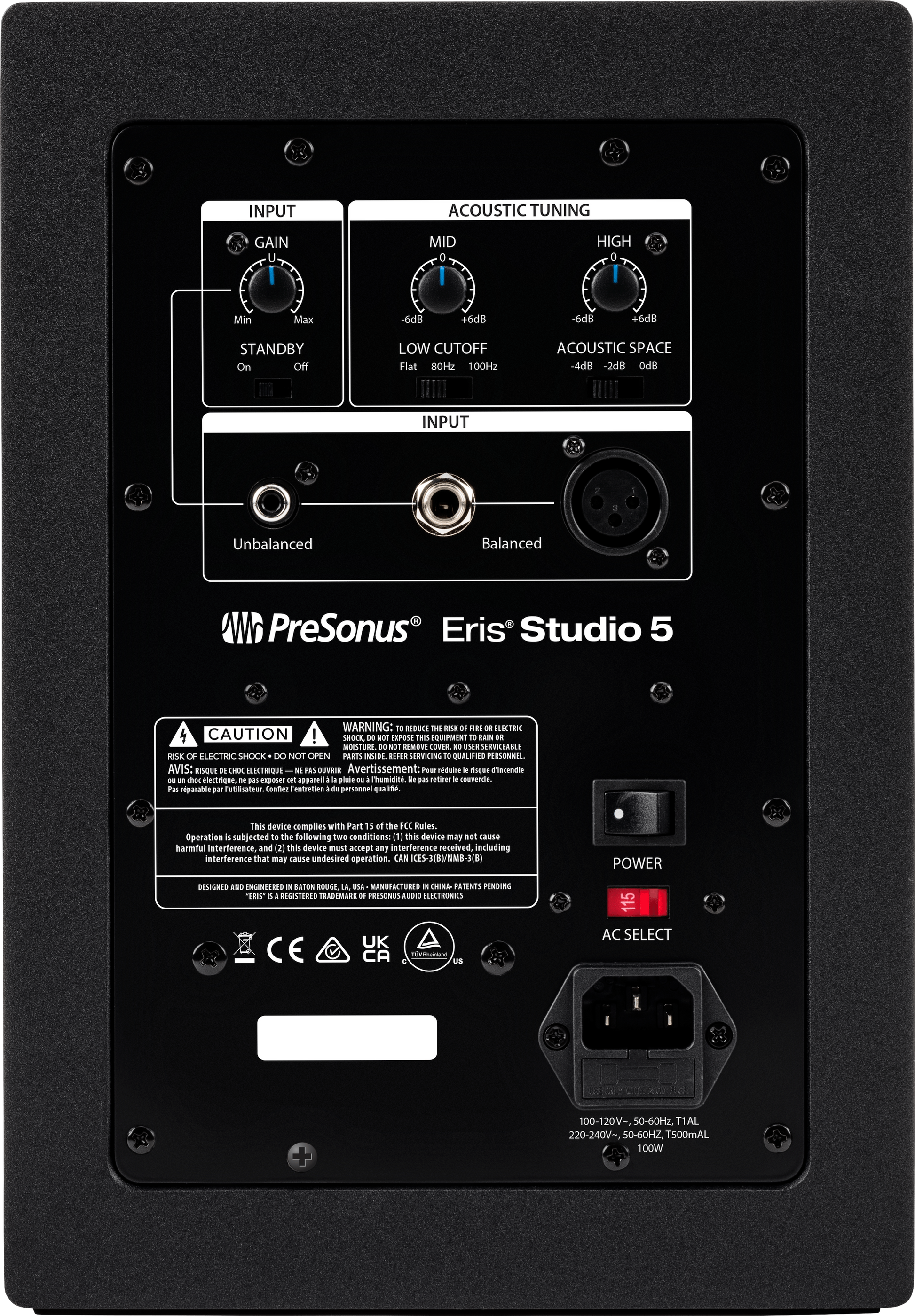 The PreSonus Eris Studio 5 delivers professional-grade monitoring for your studio setup. Premium drivers paired with an innovative EBM waveguide and front-ported design produce extended lows, refined highs, and accurate stereo imaging. Customize the sound to your space with comprehensive acoustic tuning controls, while 80-watt Class AB bi-amplification provides 102dB of headroom for demanding sessions. Multiple balanced and unbalanced inputs ensure seamless integration with your gear, and built-in protection safeguards against RF interference, thermal stress, and power surges. Studio-quality performance without the premium price tag.