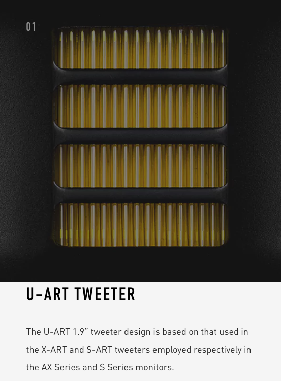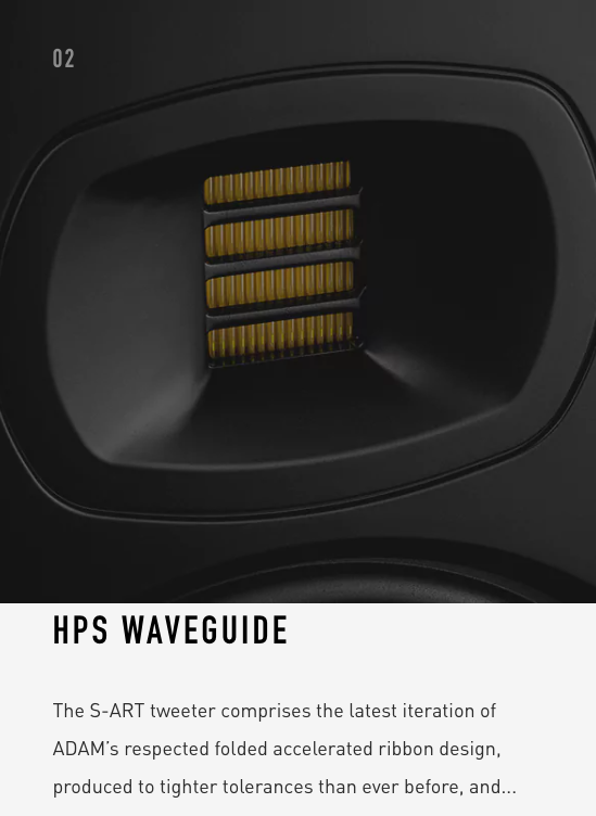 The T7V features a 7” woofer that provides bass extension down to 39 Hz, while the U-ART tweeter’s diaphragm provides pristine and extended high-frequency response up to 25 kHz – virtually unheard of in monitors in this price range. The U-ART tweeter is fitted to a precision waveguide with the same dispersion-control attributes as the High Frequency Propagation (HPS) waveguide used in ADAM Audio’s flagship S Series studio monitors. The waveguide’s highly uniform dispersion of high frequencies provides an incredibly wide sweet spot that frees you from being glued to a rigid mix position while working.