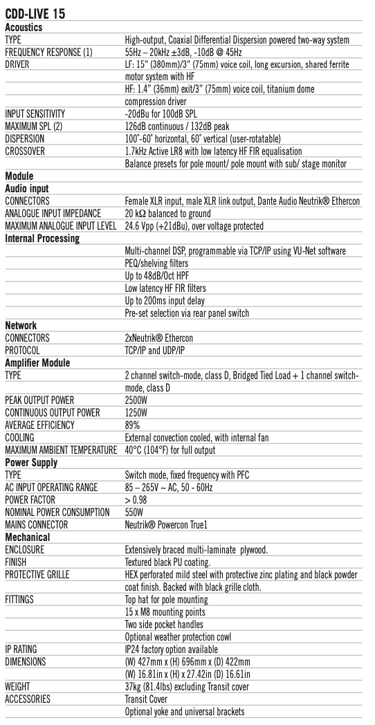 A self-powered system, the CDD-LIVE 15 incorporates a two-channel Class D amplifier, DSP and Dante™ digital audio networking — simplifying set-up, enhancing control and eliminating amplifier racks. The onboard amplifier delivers 2000W LF + 500W HF peak output to the drivers, and its switched-mode power supply auto-ranges to global mains voltages from 100 to 240V 50/60Hz.