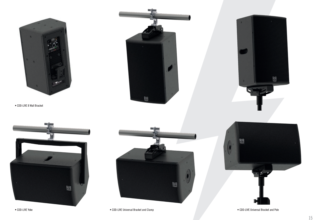 The CDD-LIVE 15 is incredibly versatile. Its multi-angle enclosure can be used in either horizontal or vertical orientation, with rotation of the driver easily accomplished by removing the screw-free, protective grille. The tour-grade enclosure is constructed from multi-laminate plywood and finished in a hard-wearing polyurea coating. Integral fittings include a top-hat for pole mounting and multiple M8 inserts for attachment to a yoke or universal bracket with a wide range of up and down tilt angles.