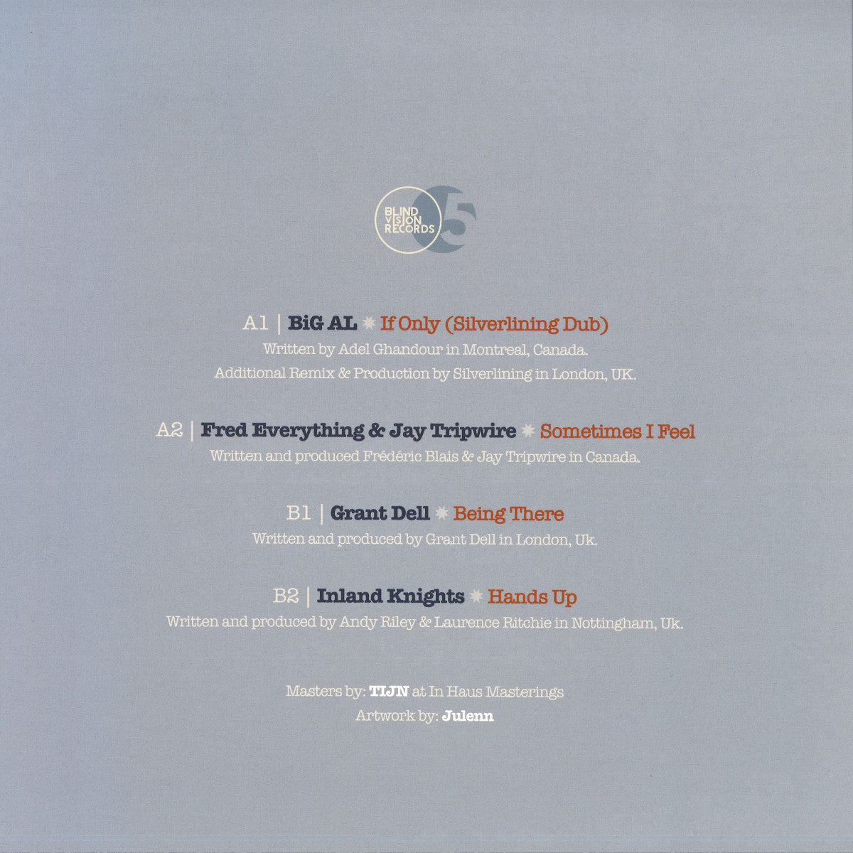 The Blind Vision label celebrates five years in the age with a nice look back at some of its Hidden Treasures From The Past. Big Al gets underway with an immediatly catchy and dubbed out, stripped back and cool-as-you-like groove in 'If Only' (Silverlining dub). Fred Everything & Jay Tripwire then link to sublet effect on the US garage groove that is 'Sometimes I Feel' with its liquid dub chords and steamy trumpet motifs, and Grant Dell goes for a deep cosmic workout on 'Being There.' Last of all is the chunky house funk of Inland Knights's 'Hands Up', a real dance floor heater with atmospheric vocal musings.