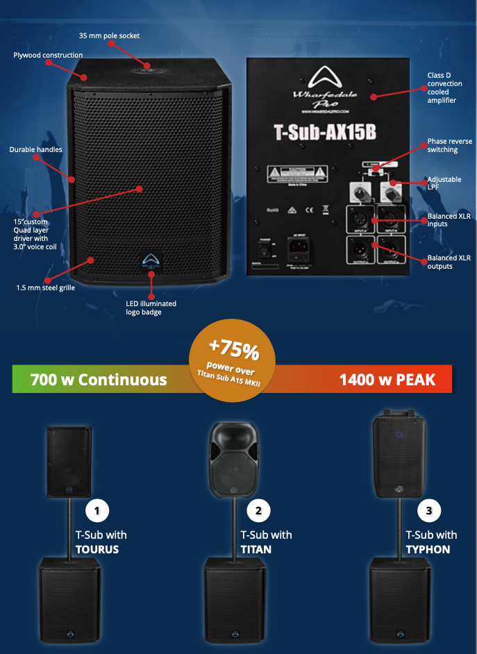 T-Sub-AX15B is the perfect companion for a Typhon or a Titan active loudspeaker. It also has 75% more power than the current Titan Sub-A15 MKII.