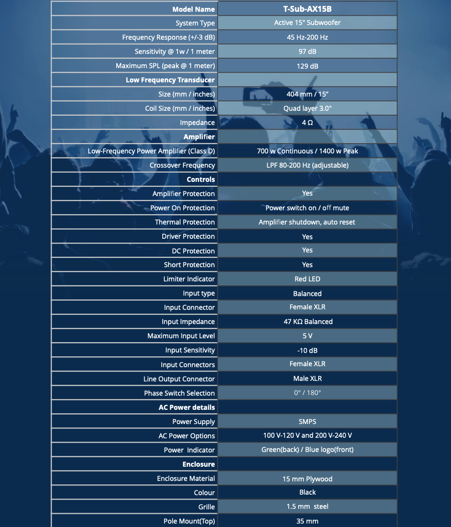 That is exactly why we have created the T-Sub-AX15B – our 700 W Continuous, 1400 W Peak 15” active subwoofer.