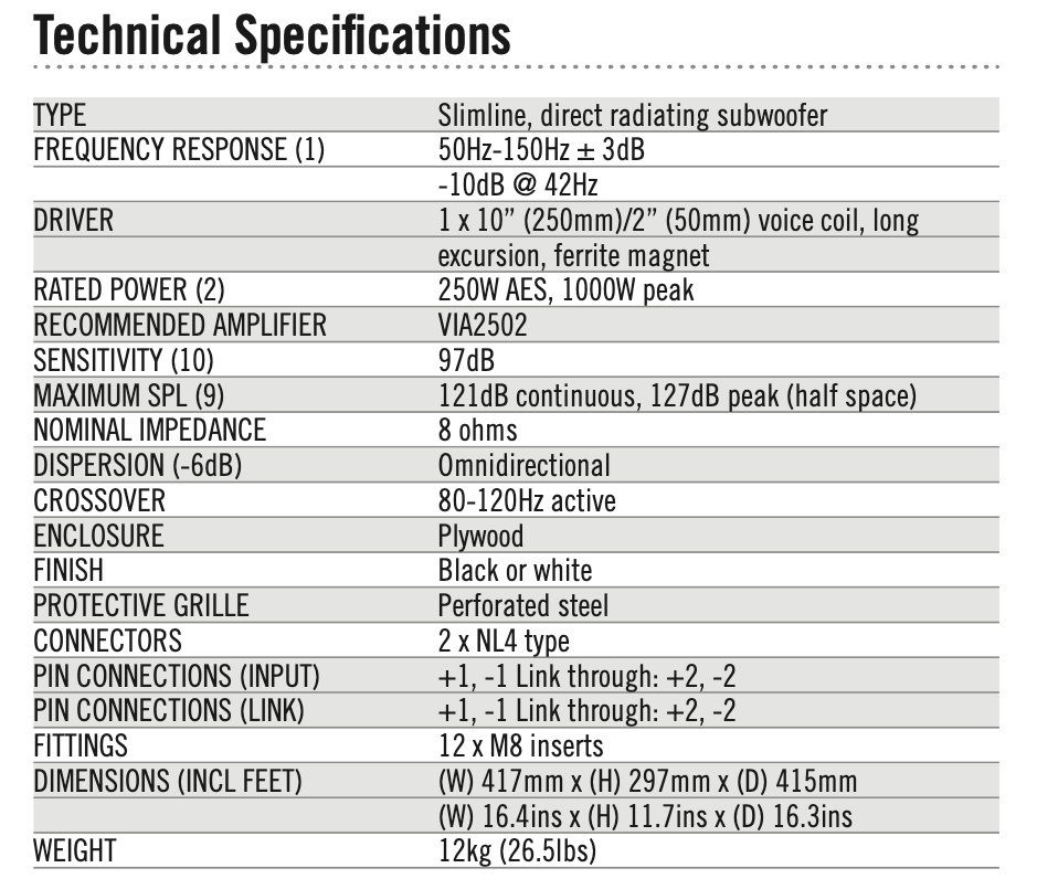 1 driver de 10" (250 mm) com bobina de voz de 2" (50 mm)