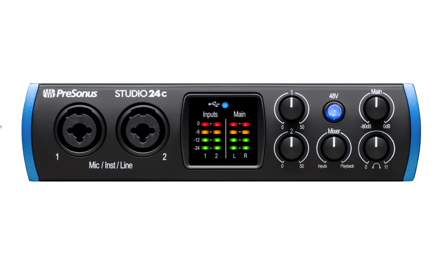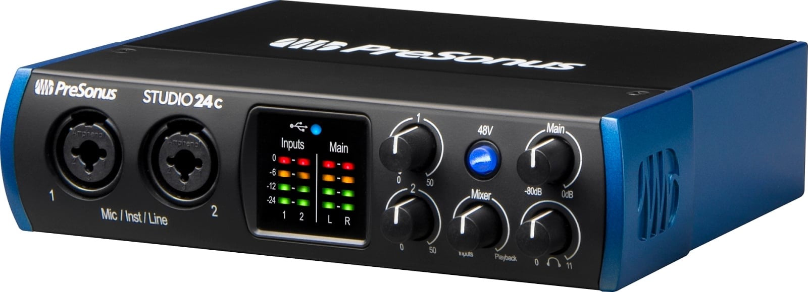 Quer você esteja gravando seu primeiro álbum ou o último episódio do seu podcast de sucesso, o Studio 24c ajudará você a soar melhor. Com dois pré-amplificadores de microfone XMAX-L imaculados da PreSonus para gravar vocais; além de pré-amplificadores de instrumentos de alto headroom para que você possa conectar sua guitarra ou baixo diretamente à sua interface; e medição de entrada profissional para que você possa acompanhar seus níveis de gravação, o Studio 24c oferece qualidade de som incrível em um formato compacto e robusto. Um estúdio de gravação doméstico completo pronto para uso, a interface de áudio Studio 24c vem com uma licença gratuita do premiado software de produção musical Studio One® Artist da PreSonus, para que você possa começar a gravar imediatamente.