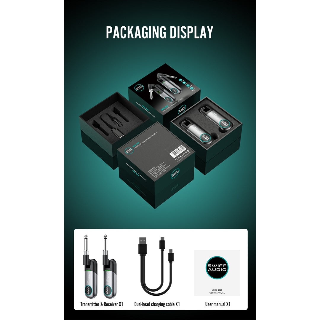 The SWIFF Audio WS-80 Wireless System offers musicians a reliable and high-quality wireless audio solution. With its universal compatibility, extended transmission range, low latency, and rechargeable battery, it ensures seamless performances without the hassle of cables.